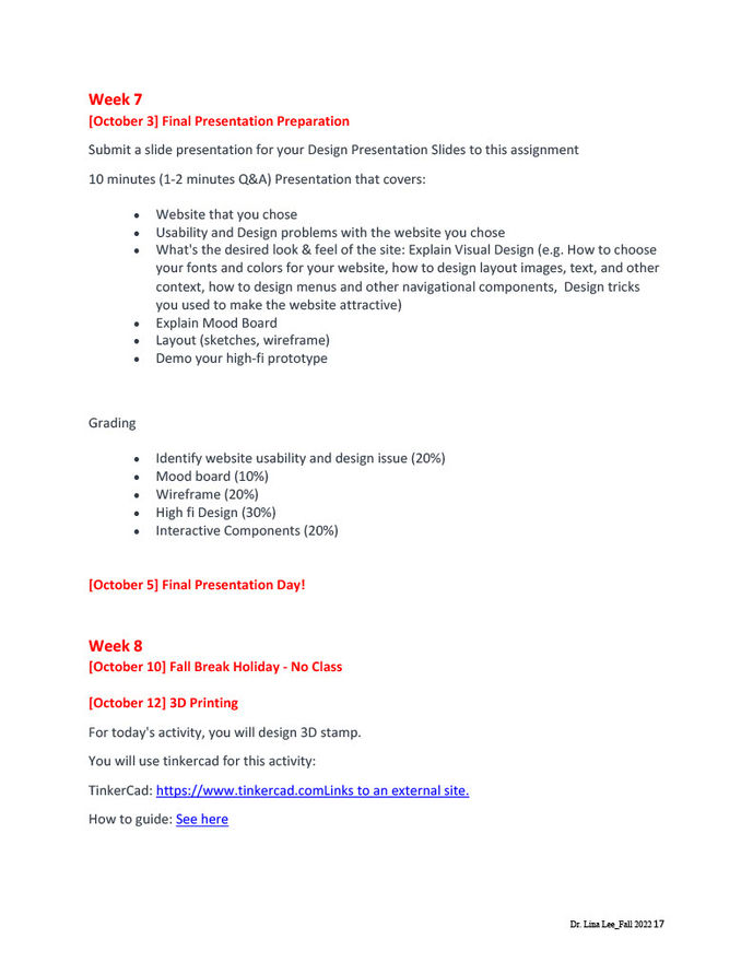 In my courses, I guide students through active learning exercises that develop their critical thinking and problem-solving skills. Through design critiques, students refine their ability to analyze and improve their work while learning to use Human-Computer Interaction (HCI) techniques, including heuristic evaluations, needfinding analysis, prototyping, personas, and storyboards.