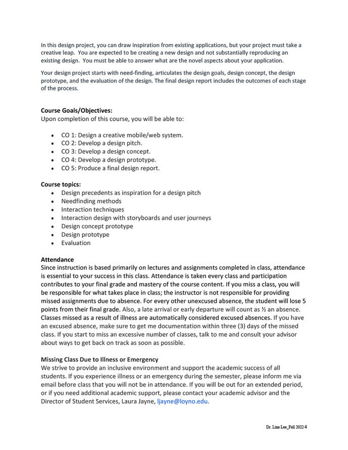 During my time at Loyola, I have developed and taught six courses that emphasize hands-on learning and foster a deep connection between theory and practice. These courses include Interactive 1, Interactive 2, Human-Centered Design, UX Design, UX Rapid Prototyping, and Web Portfolio Development. Each of these courses is carefully crafted to prepare students for the dynamic design industry by focusing on both technical proficiency and creative problem-solving.